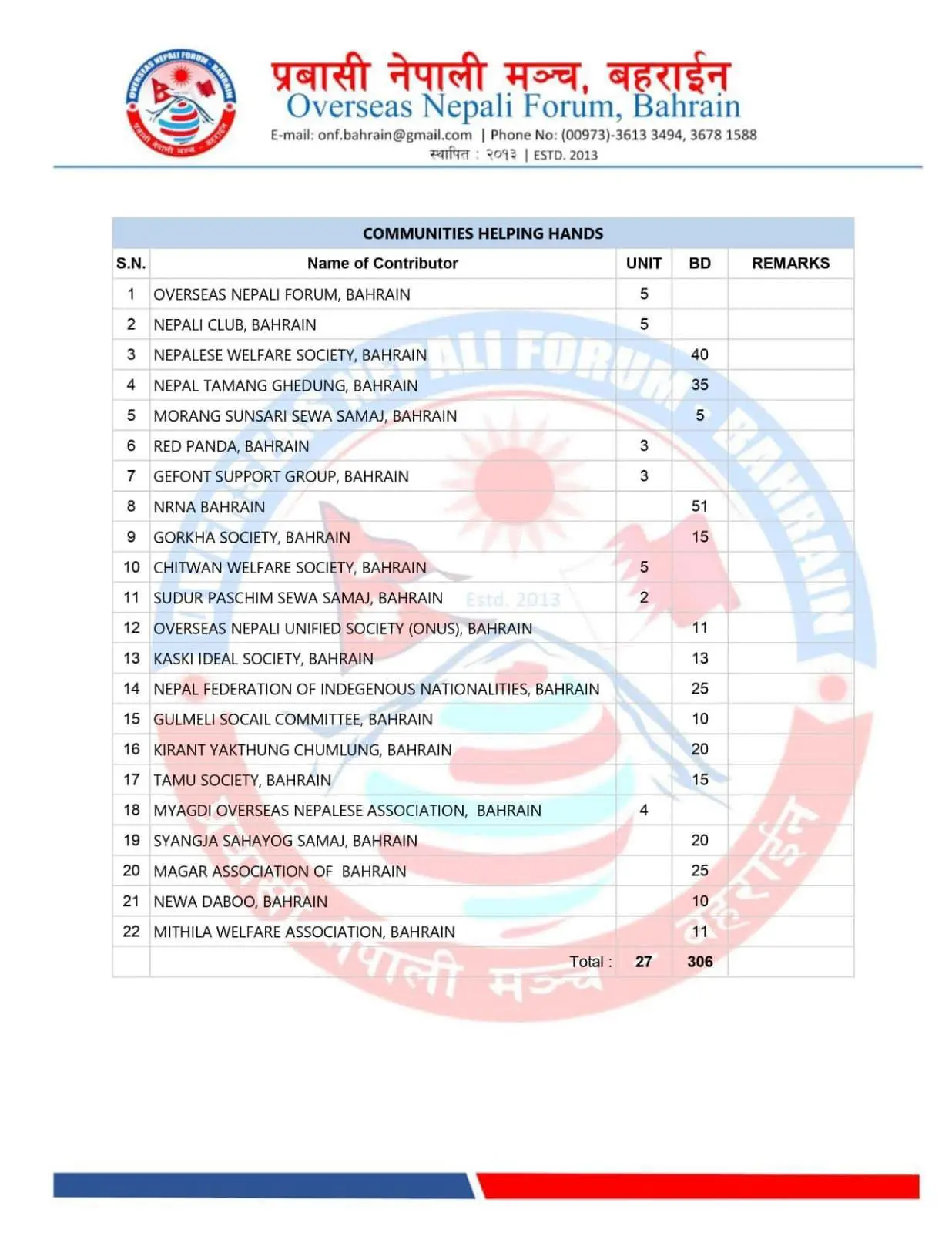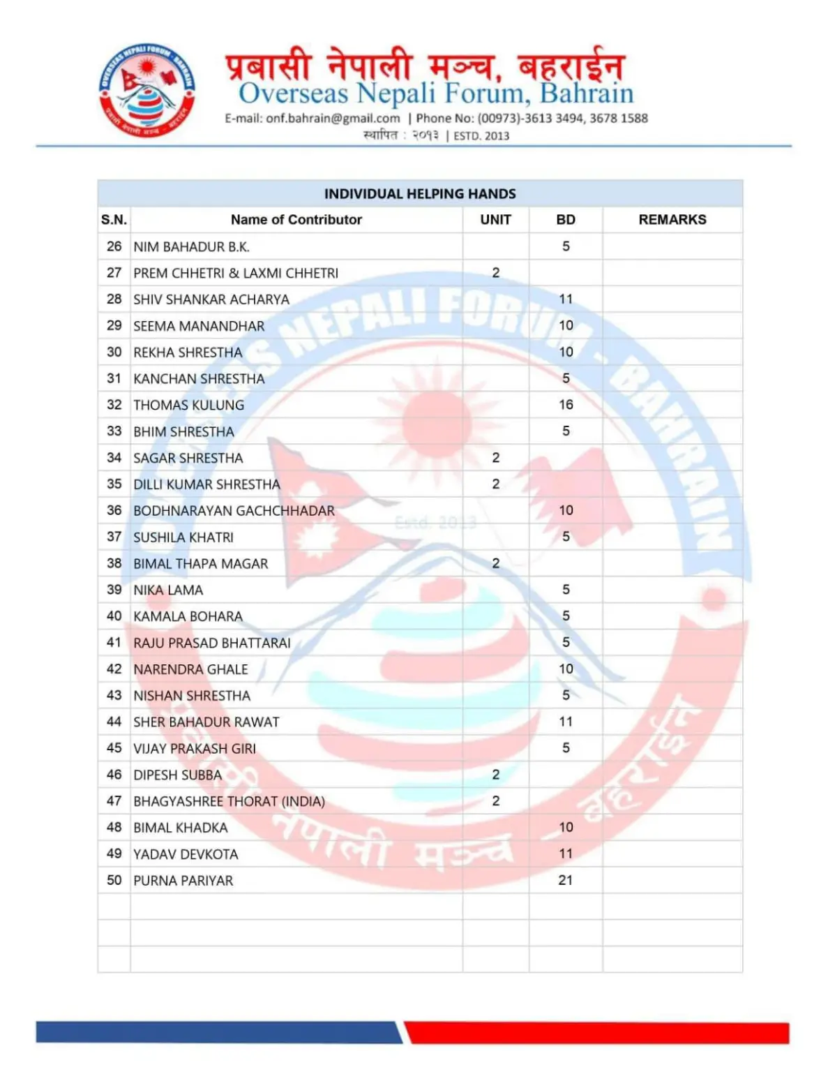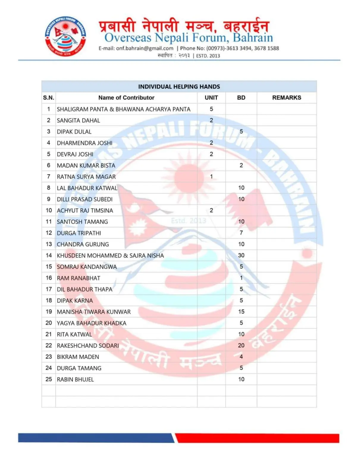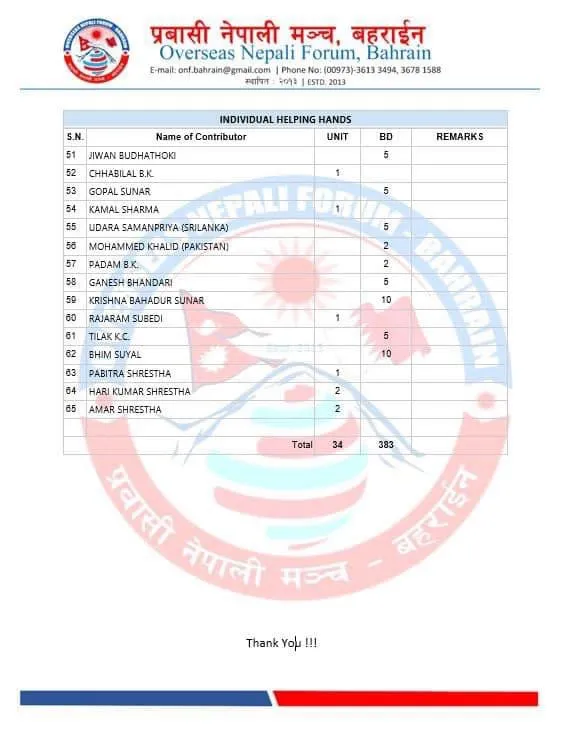हस्तान्तरणको लागि उपस्थित भएका नेपाली दुतावासका प्रतिनिधी शकील मोहमद, प्रवासी नेपाली मञ्चका मध्यपुर्व संयोजक शालीग्राम पन्त , प्रवासी नेपाली मञ्च बहराइनका सचिव अमर श्रेष्ठ लगायत गैर आवासीय नेपाली संघका सन्त कुमार न्यौपाने र संगिता दाहाल, नेप्लिज वेलफेयर सोसाइटीका हिमाल घिमिरे, रामु काफ्ले र जिफन्ट सपोर्ट ग्रुपका थोमस कुलुङ्लाई मंचले धेरै धेरै धन्यवाद ब्यक्त गरेको छ । सहयोग प्रदान गर्दा टुर्किय दुतावासका राहत संयोजक र सिरियन दुतावासका राहत संयोजकले सहयोगि मनहरु सम्पूर्ण नेपालीहरुलाई धेरै धेरै धन्यवाद व्यक्त गरेका छन। मन खोलेर सहयोग गर्ने सम्पूर्ण सहयोगि संघ-संस्था, संगठन एवम् नेपाली दिदिबहिनी तथा दाजुभाईहरुलाई साथै यस कार्यका लागि समन्वय गर्ने नेपाली राजदुतावास परिवारलाई पनि प्रवासी नेपाली मञ्च राष्ट्रीय कमिटी बहराईनले हार्दिक आभार ब्यक्त गरेको छ ।- जनसवाल डट कमवाट