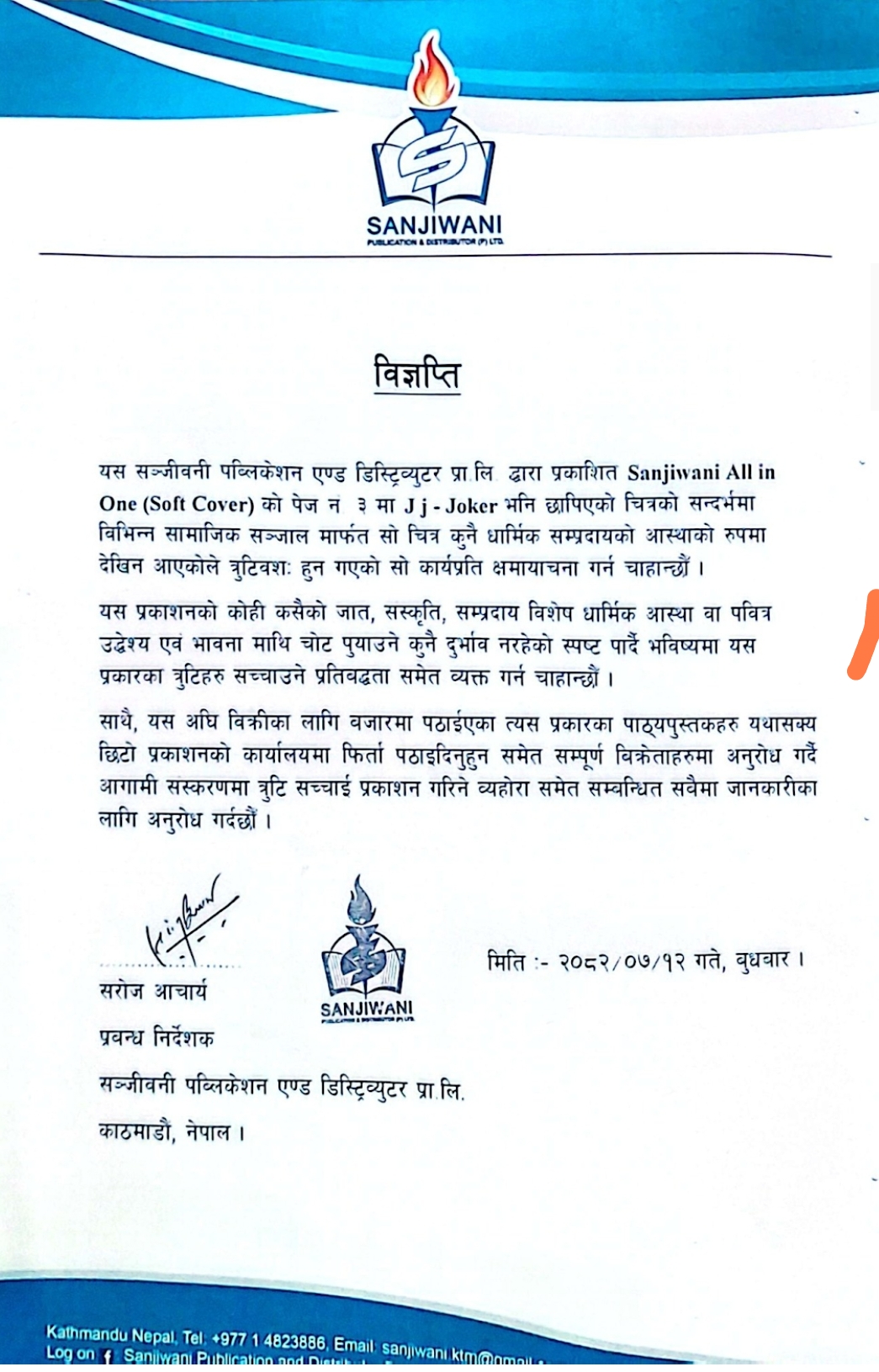विवाद फैलिएपछि प्रकाशन गृहले विज्ञप्ति जारी गर्दै त्रुटिप्रति माफी मागेको छ । कम्पनीका प्रबन्ध निर्देशक सरोज आचार्यले कुनै समुदायको आस्था र संस्कृतिमा चोट पुर्याउने उद्देश्य नभएको स्पष्ट पारेका छन् । उनले भने, “हामीले कुनै दुर्भाव राखेका छैनौं । गल्तीप्रति क्षमा चाहन्छौं र आगामी संस्करणमा यो त्रुटि सच्याउनेछौं।”