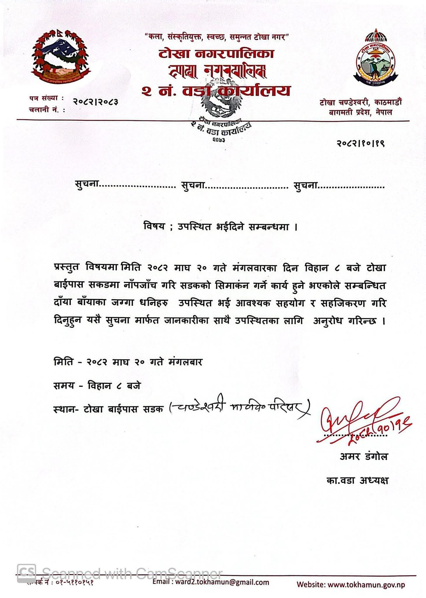 टोखा नगरपालिका २ ले टोखा बाइपास सडकको सिमांकन कार्य अघि बढाउने तयारी गरेको छ। सो कार्य प्रभावकारी र सहज बनाउन सम्बन्धित क्षेत्रका स्थानीय जग्गाधनीहरूलाई उपस्थित हुन टाेखा नगरपालिका वडा २ ले अनुरोध गरेको छ।