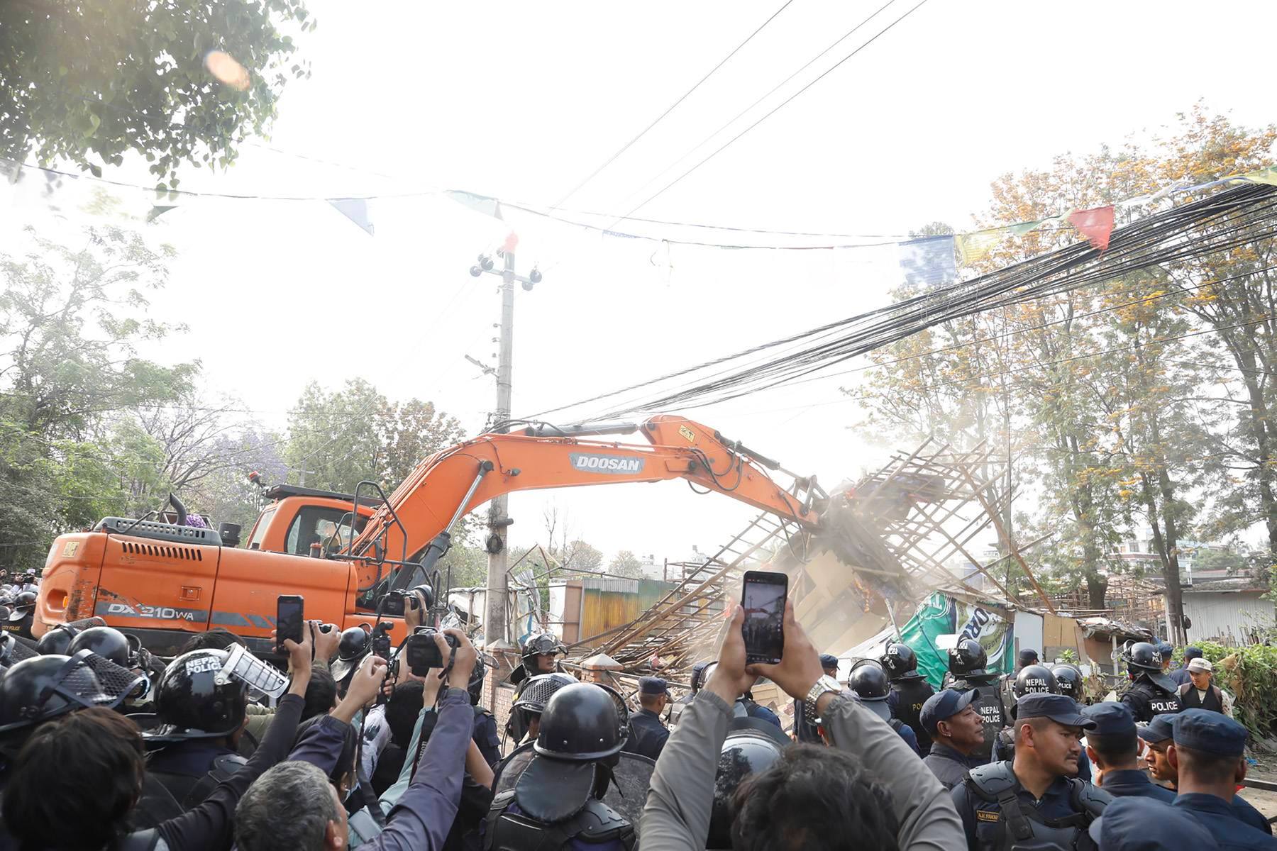 काठमाडौँ, १२ वैशाखः थापाथलीस्थित बागमती नदी किनाराका घरटहरा शान्तिपूर्ण रूपमा हटाइएका छन् । हालसम्म ४० प्रतिशत टहरा हटाइएका छन् । नेपाल प्रहरी, सशस्त्र प्रहरी बल नेपाल र काठमाडौँ महानगर प्रहरीले संयुक्त रूपमा घरटहरा हटाइरहेका छन् । बल प्रयोग नगरी शान्तिपूर्ण रूपमा थापाथली क्षेत्रका करिब ४० प्रतिशत घरटहरा हटाइसकिएको काठमाडौँका प्रमुख जिल्ला अधिकारी ईश्वरराज पौडेलले जानकारी दिनुभयो । “अवैध रूपमा बनाइएका संरचना हटाउन सुरक्षाकर्मीले बल प्रयोग गर्नुपर्ने अवस्था कहीँ पनि छैन । त्यहाँ बसोबास गरिरहनुभएका नागरिकले सरकारको अभियानलाई सहयोग गरिरहनुभएको छ”, प्रजिअ पौडेलले भन्नुभयो, “सुकुमबासीलाई घरटहरा खाली गर्न सुरक्षाकर्मीले मद्दत गरिरहेका छन् ।” आवश्यक पर्नेलाई सुरक्षाकर्मीले मानवीय सहायता पनि गरिरहेका उहाँले जानकारी दिनुभयो । सरकारले दुई दिन अघि देखिनै जोखिमयुक्त सार्वजनिक क्षेत्रमा बसिरहेका सुकुमबासी तथा भूमिहीनलाई आफ्ना सरसामान, पशुचौपायलाई सुरक्षित स्थानमा सार्न आग्रह गर्दै आएको थियो । थापाथली क्षेत्रमा अवैध संरचान हटाउन सुरक्षाकर्मी, प्राविधिक, डोजर अपरेटर, एम्बुलेन्स, सामग्री ओसापसार गर्ने ट्रक, उद्धार गरिएको नागरिकलाई पहिलो आश्रयस्थलसम्म लैजान कर्मचारी ओसार्न प्रयोग हुँदै आएका सवारीसाधन सञ्चालन गरएका प्रजिअ पौडेलले जानकारी दिनुभयो । “धेरैले आफ्नो व्यवस्थापन आफैँ गरेका छन् । सहयोग आवश्यक पर्नेहरू सरकारसँग माग्न आउनुहुन्छ, उहाँहरूलाई सोहीअनुसार व्यवस्थापन गर्छौं,” प्रजिअ पौडेलले भन्नुभयो । थापाथलीका सुकुमबासीलाई त्रिपुरेश्वरस्थित दशरथ रङ्गशाालामा राखिएको छ । त्यहाँ उनीहरूको विवरण सङ्कल भइरहेको छ । वास्तविक सुकुमबासी पहिचान भएपछि उहाँहरूलाई अस्थायी बसोबासका लागि व्ययवस्था गरिएको स्थानमा स्थानानतरण गरिनेछ । अस्थायी बसोबासको प्रबन्ध शहरी विकास मन्त्रालयले गरिरहेको छ । “सुरक्षाकर्मीहरूले उहाँहरूका सरसामग्रीको सुरक्षा, अपङ्गता भएका, ज्येष्ठ नागरिक, बिरामी, अशक्त, दीर्घरोगी, बालबालिका, गर्भवती, सुत्केरीलगायत मानवीय सहयोग उपलब्ध गराइरहनुभएको छ”, प्रजिअ पौडेलले भन्नुभयो, “उपचार सेवा आवश्यक भएकालाई अपस्पताल पठाइएको छ ।” वस्तीबाट सामान सार्नका लागि सरकारी ट्रकको पनि प्रयोग गरिएको छ । प्रमुख जिल्ला अधिकारी पौडेलले आज काठमाडौँको थापाथली क्षेत्र र गैरीगाउँ सिनामङ्गल क्षेत्रका घरहटरा हटाइने जानकारी दिनुभयो । “समयले भ्याएसम्म आजै मनोहरा क्षेत्रमा पनि त्यस्ता बस्ती हटाउन सुरु गरिनेछ”, उहाँले भन्नुभयो । यसैबीच, मनोहराका सुकुमबासी पनि घरटहरा छाडेर गएका छन् । उनीहरूलाई सुरक्षाकर्मीले आफ्ना सामग्रीलाई सु